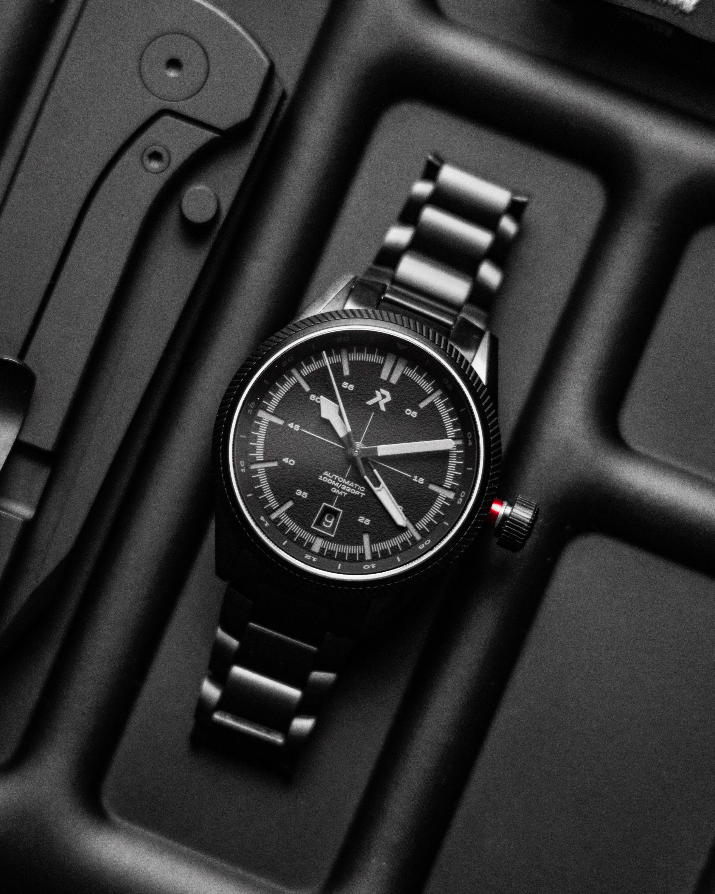 One glance at the Fortitude GMT and you'll know why it's the pilot's watch. Featuring a jet turbine inspired bezel, signature hands & indexes, a sandwich dial with generous lume, and an extra-large crown, whether you're in the cockpit, jump seat or backseat, you'll always know when it's time for take-off. Prioritizing legibility, the custom handset for ‘local time’ and a prominent ‘home time’ hand ensures you'll never lose a minute crossing borders or timezones.