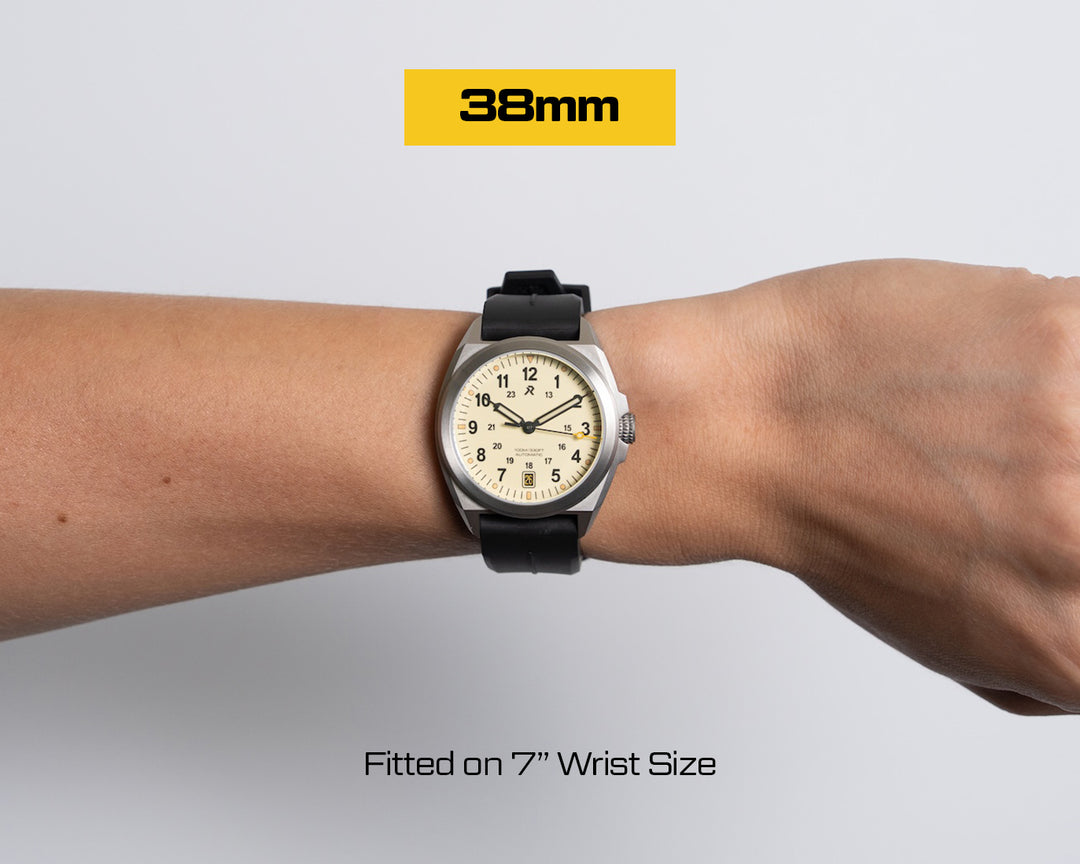 Perfectly suited for enthusiasts with smaller to medium wrists, the 38mm case offers an ideal fit that mirrors the compact, yet robust field watches. It strikes the perfect balance—bold enough to make a statement, yet refined enough to wear comfortably on your journey. A nod to the past, designed for today’s explorer.