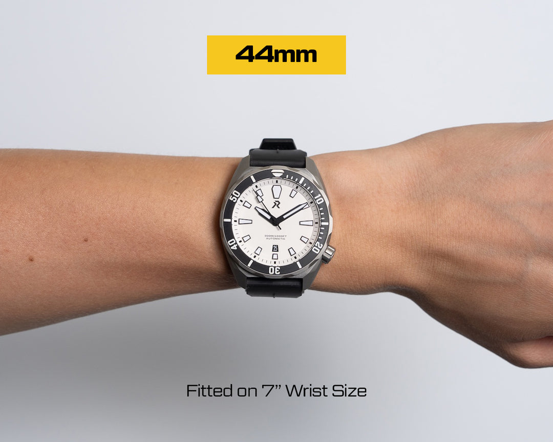Gear up for the ultimate adventure with our 44mm Dive Case, the largest and boldest in our collection. Crafted for those who want a watch that commands attention, this case size is made for the wearer who embraces a substantial presence on the wrist. With the growing demand for larger, more assertive timepieces, the 44mm Dive Case is perfect for wrists larger than 7 inches, offering the ideal fit and a powerful visual impact.