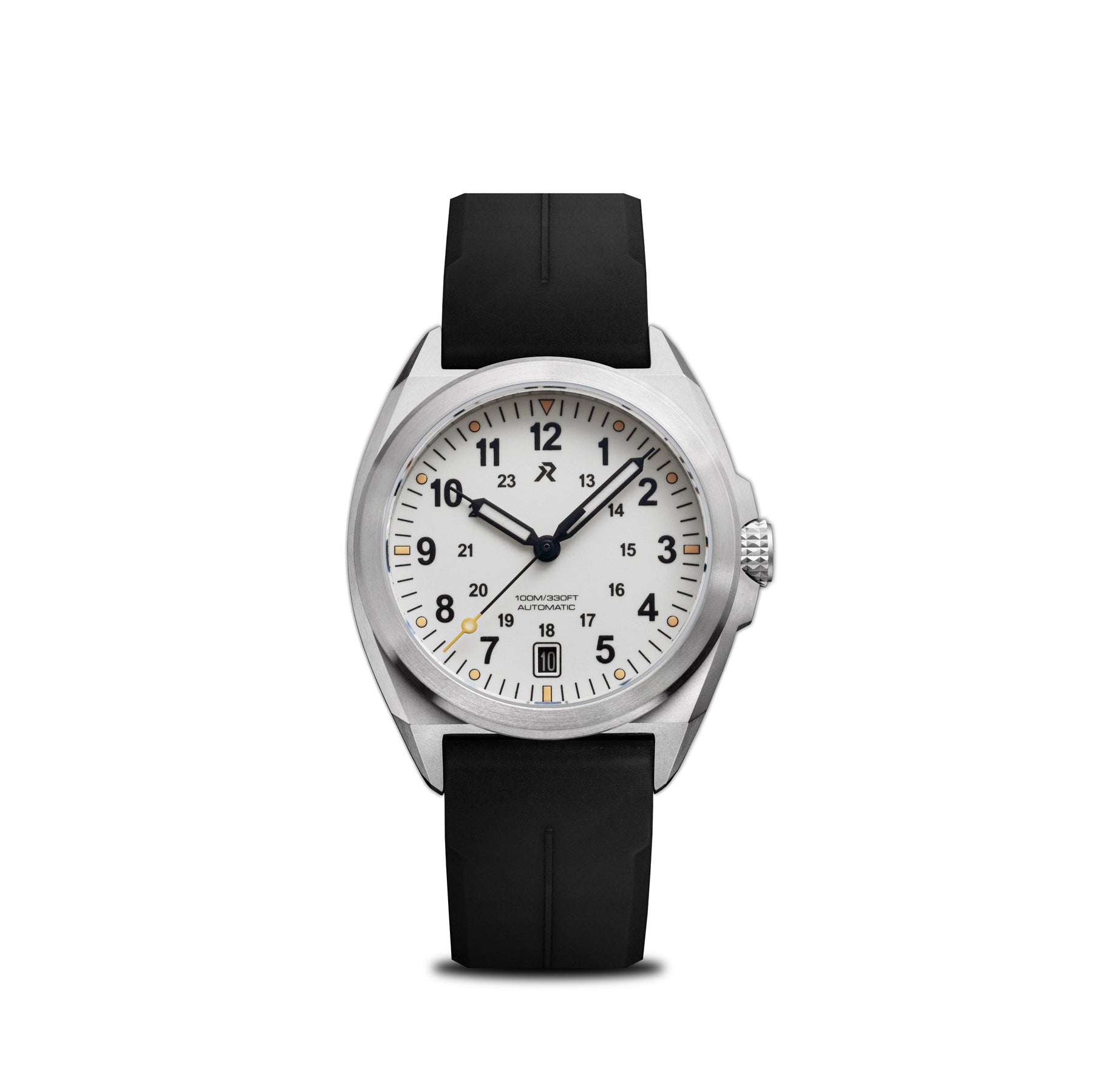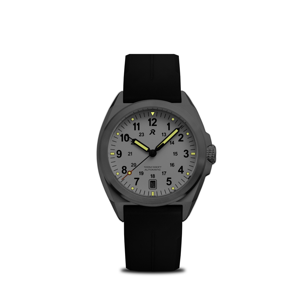 Better with time, the Valour 38 has been remastered with fresh new dials, an updated handset, date complication, and a Viton™ gasket; prepared for those wet and muddy excursions, the Valour 38 now arrives adventure ready on our premium HexaFlex rubber strap.